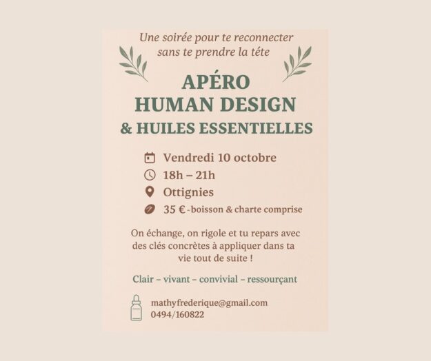 Apéro Human Design à Ottignies (10/10) : découvre ton type énergétique dans une soirée conviviale et claire. Places limitées, 30 €.